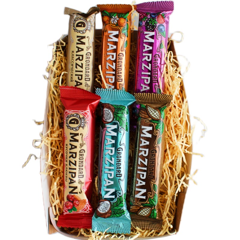 В составе набора 6 марципановых батончика с разными вкусами: классика, шоколадный мусс, с апельсином, с кокосом, с клюквой, с лесными ягодами от фабрики Grondard.
