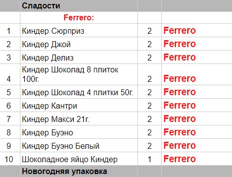 Киндер Сюрприз (2 шт), Киндер Джой (2 шт), Киндер Бонс (2 шт), Киндер Шоколад 8 плиток 100г. (2 шт), Киндер Шоколад 4 плиток 50г. (2 шт), Киндер Кантри (со злаками) (2 шт), Киндер Макси 21 г. (2 шт), Киндер Буэно (2 шт)