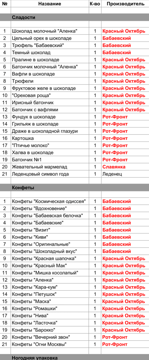 Шоколад молочный "Аленка" (1 шт), Пралине в шоколаде (1 шт), Батончик молочный "Аленка" (1 шт), Вафли в шоколаде (1 шт), Трюфели (1 шт), Фруктовое желе в шоколаде (1 шт), "Ореховая роща" (1 шт), Ирисный батончик (1 шт), Батончик с вафлями (1 шт), Конфеты "Красная шапочка" (1 шт), Конфеты "Красный Мак" (1 шт), Конфеты "Мишка косолапый" (1 шт), Конфеты "Аленка" (1 шт), Конфеты "Кара-кум" (1 шт), Конфеты "Петушок" (1 шт), Конфеты "Маска" (1 шт), Конфеты "Ромашки" (1 шт), Конфеты "Нива" (1 шт), Конфеты "Ласточка" (1 шт), Конфеты "Барокко" (1 шт)