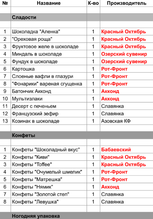 Картошка (1 шт), Слоеные вафли в глазури (1 шт), "Фонарики" вареная сгущенка (1 шт), Конфеты "Очумелый шмелик" (1 шт), Конфеты "Матрешка" (1 шт)